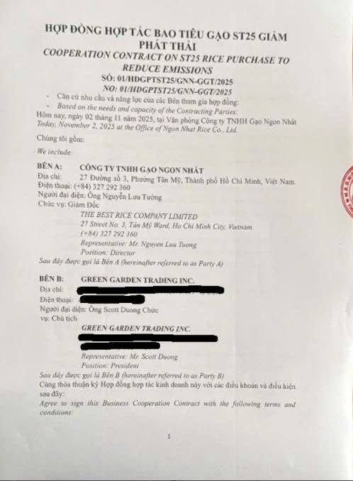 Công ty TNHH GẠO NGON NHẤT – Việt Nam chính thức ký kết Hợp đồng bao tiêu Gạo ST25 Phát Thải Thấp với đối tác chiến lược Green Garden Trading Inc – USA. Đây là một dấu mốc quan trọng, thể hiện cam kết về nông nghiệp sạch – phát thải thấp – tiêu chuẩn quốc tế, đồng thời khẳng định vị thế gạo Việt trên thị trường toàn cầu.